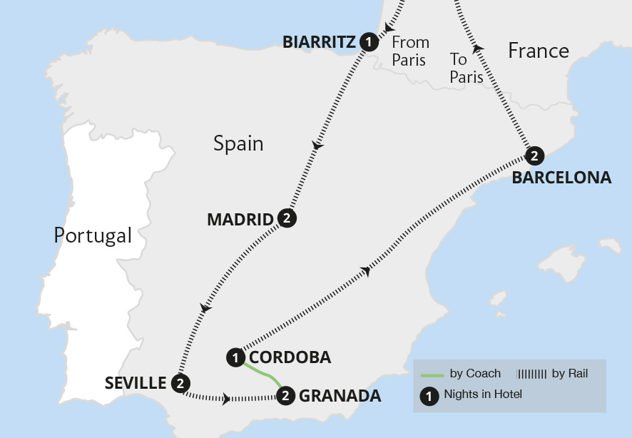 • Journey from the capital of Madrid, into Moorish Andalucía and Barcelona