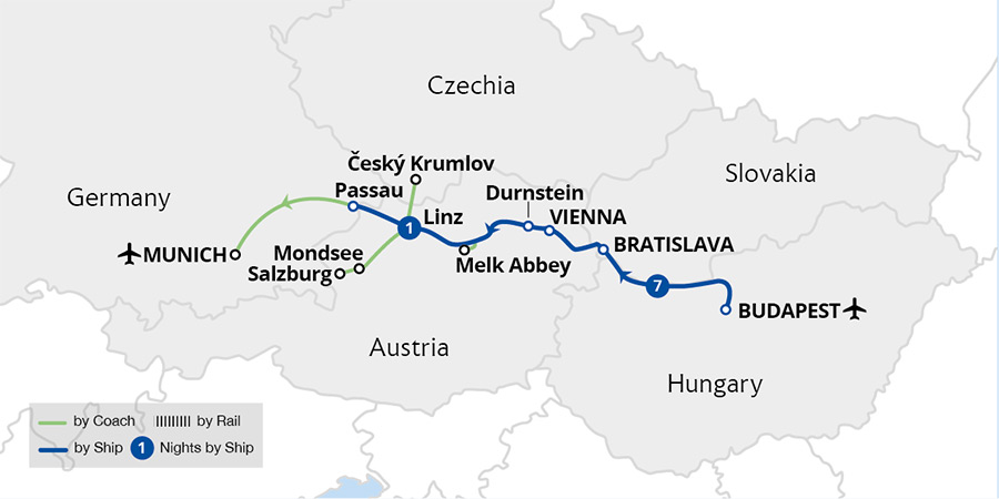 Fly to Munich for a luxurious cruise down the blue Danube, uncovering the beauty and culture of this scenic river. Delve into the rich history of the Ottoman and Habsburg empires and wander among inspiring architecture in Budapest and Vienna. Sail the beautiful Wachau Valley, visiting Dürnstein and historic Melk Abbey. Arriving in the...