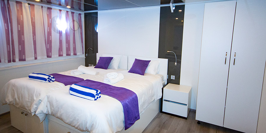 • Cabins feature air-conditioning, a safe, an audio system, a wardrobe, desk, sofa, and porthole window. En-suite bathrooms include a shower and a hairdryer and beds can be configured to twins or a double.