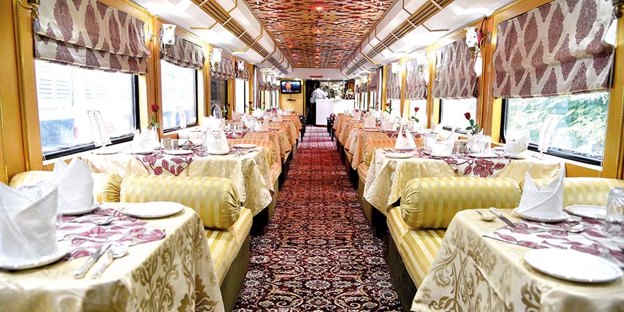 When you take the Ultimate Rajasthan tour on the Palace on Wheels, the journey begins and ends in Delhi, and includes visits to Jaipur, Udaipur, Jaisalmer, Jodhpur - the blue city, and Agra where guests will visit the Taj Mahal. This famous train gives travellers a taste of the royal Indian lifestyle from a bygone era, with graceful hospitality and 5 star food. The restaurant serves beautiful food inspired by cuisines from around the world. The saloon carriages have been restored and decorated to reflect the cultural ethos of each royal state, and give travellers a real sense of the royal history of the train.