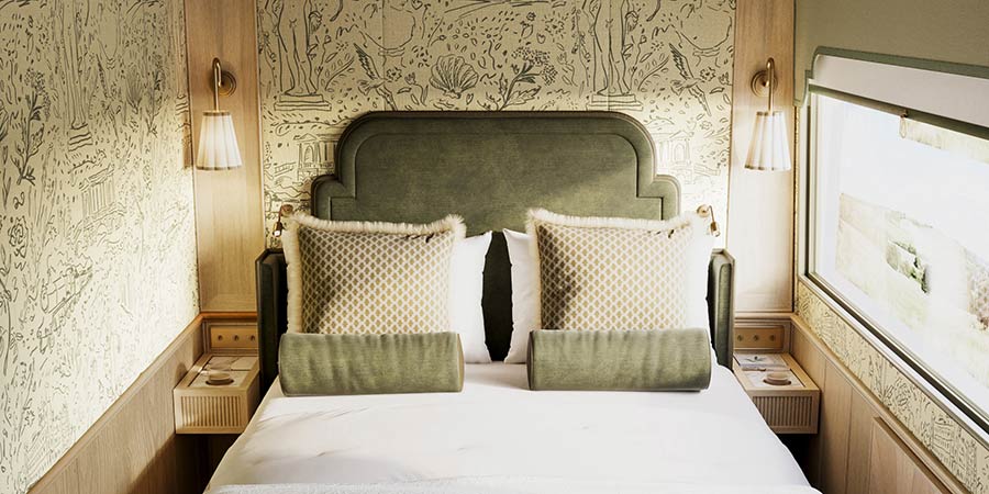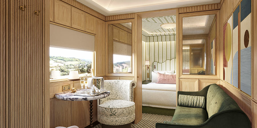 Stunning suite cabins offer a cosy haven on your journey. Décor featuring work by English artist Luke Edward Hall reflect the Great British countryside and coastlines that passes by your large window. Suites effortlessly transform from a comfortable place to relax in the day with soft banquette seating, to a peaceful plush double bedroom to rest your head at night. With the choice of Double and Twin options, both complete with ensuite bathrooms and fold-out table and stool, you will find the perfect configuration to suit your needs.